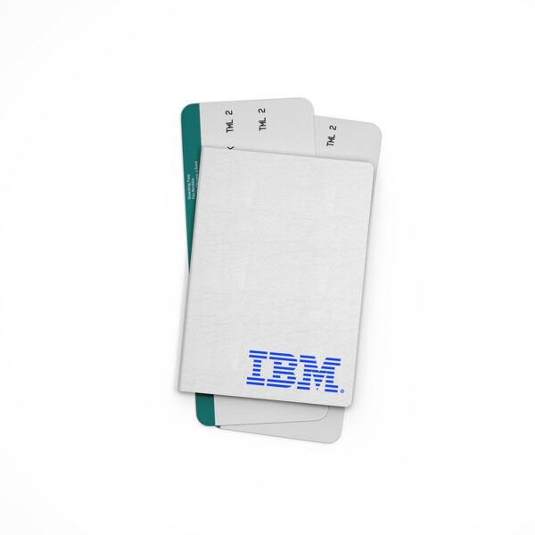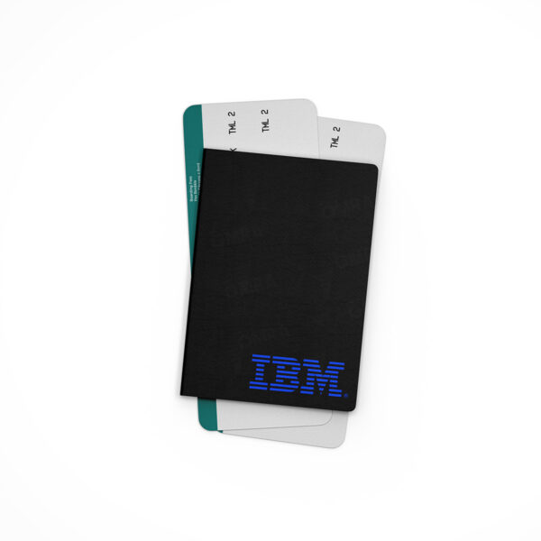 IBM Passport Cover. Faux leather material. Functions as a travel wallet with slots for credit cards. Elastic drawstring closure – tuck your boarding passes in!